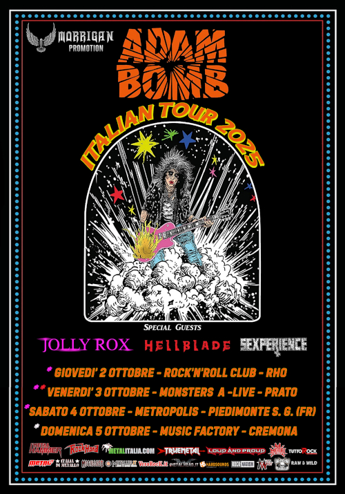 Ad accompagnare Bomb e la sua band per i primi tre show avremo i JOLLY ROX, band glam metal tra le più importanti del panorama italiano che quest’anno festeggia i 20 anni di attività. Con loro divideranno il palco nella data di venerdì gli HELLBADE con il loro metal di stampo ottantiano, mentre nell ultimo show ad affiancare Bomb ci saranno i SEXPERIENCE, band che propone un heavy ricco di groove e potenza. Come al solito vi aspettiamo numerosi e selvaggi!!!