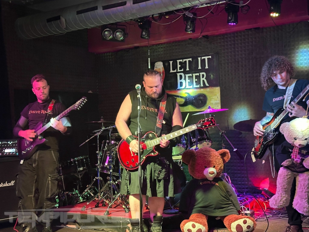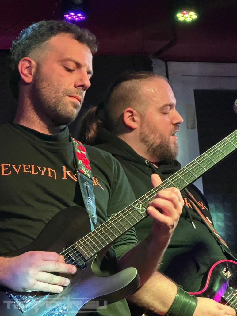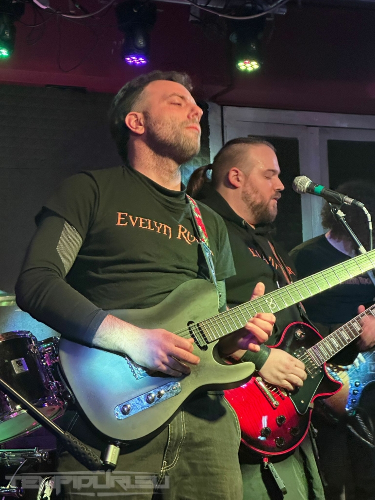 Prima band ad aprire le danze i Capitolini  Evelyn  Roger,  gradita sorpresa della serata perchè di solito  la  prima band è sempre quella che un po delude invece  questi quattro ragazzi mescolano la  NWOBHM  anni 80  a genere più moderno gli otto brani saccheggiano quasi  completamente il loro unico album uscito  Pistole Tra  i  Peluche  più l’ultimo brano che risale ad una loro  prima  registrazione. La qualità si sente i quattro pirati con il  loro look tra l’On The Roads al Kilt total black del  cantante narrano le loro scorribande di strada  accompagnati dai loro due peluche uno vicino al  batterista e l’altro enorme attaccato al basso di  Michelangelo  un vero tessitore di suoni con un groove  pazzesco, il cantante  Alessio  è bravo nei modi della  voce ricorda molto secondo me  Damiano  dei  Maneskin  con questa voce robusta e Glam non ,me ne  voglia ma secondo me è un complimento.