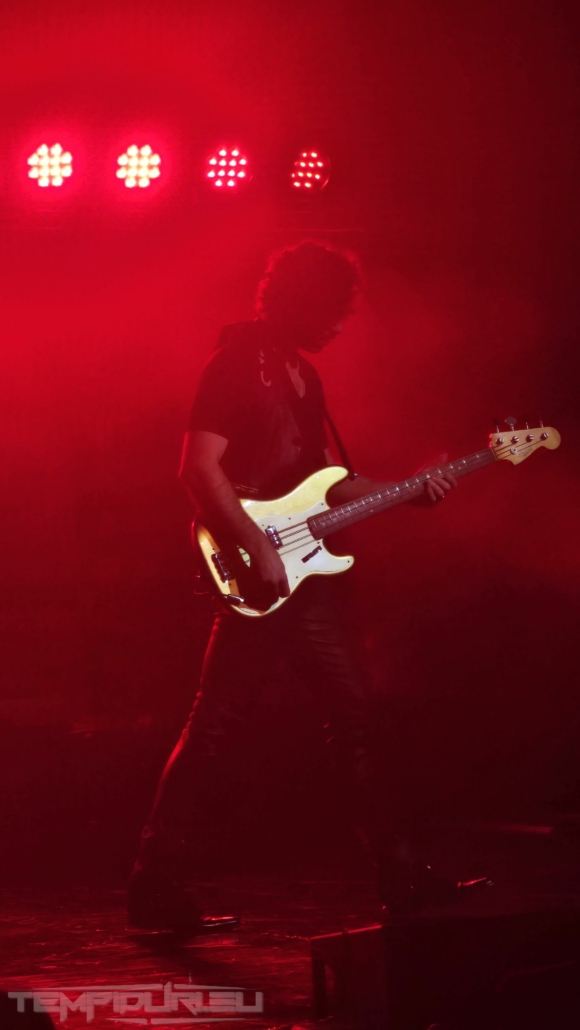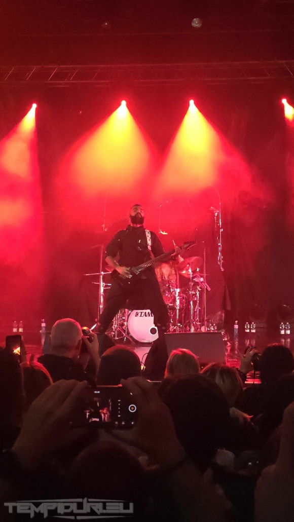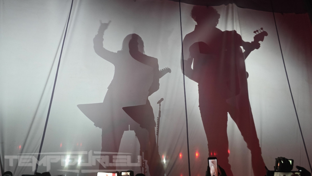 Il cambio palco è stato rapido ma denso di tensione. L’intero Alcatraz era immerso nel buio, un enorme telo bianco copriva la scena. Quando le prime note di “Fallen Star” hanno risuonato, sullo schermo si sono stagliate le ombre delle sagome della band, in controluce, tra luci e fumo.