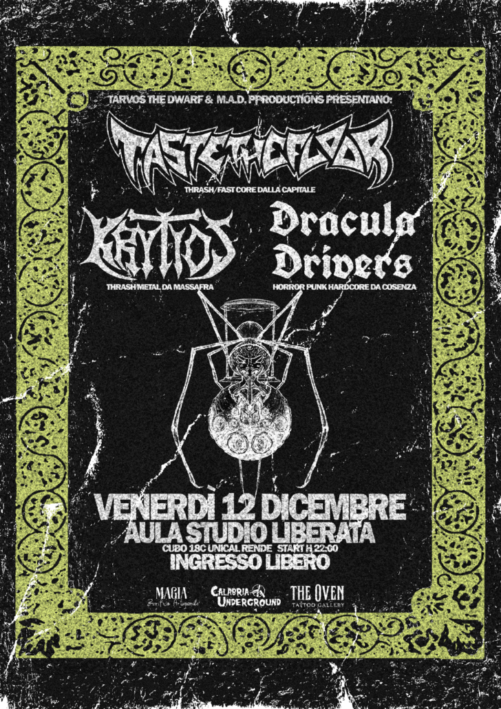 L’ultimo evento live del 2025 è pronto a esplodere all’Aula Studio Liberata, nel cuore dell’UNICAL, grazie alla collaborazione tra la crew del collettivo e l’instancabile lavoro di Tarvos The Dwarf. Una serata che riunisce tre realtà potenti della scena underground italiana per un unico, devastante appuntamento ad ingresso gratuito.