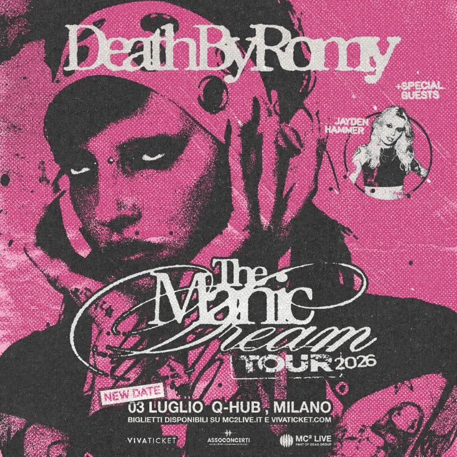Dopo il rinvio del concerto del 12 febbraio per motivi di salute, DEATHBYROMY annuncia il recupero dello show di Milano.L’artista si esibirà il 3 luglio 2026 al Q-Hub di Milano e in apertura di serata si esibirà Jayden Hammer.I biglietti già acquistati per il concerto originariamente programmato al Legend Club Milano restano validi per il nuovo appuntamento.