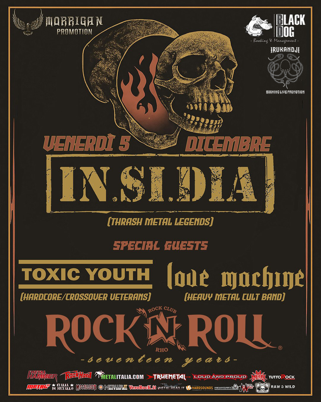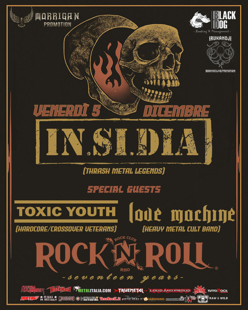 Per festeggiare il suo diciassettesimo compleanno, sul palco di Rock’n’Roll di Rho arriva una vera leggenda del metal italiano ovvero i seminali thrasher IN.SI.DIA .Nati nel 1987, con il loro primo album “Istinto e Rabbia” del 1993 riscuotono un enorme successo e nel 1995 con l’uscita di “Guarda dentro te”, questo non solo si conferma ma si amplifica portando la band in tour per due anni. Dopo lo scioglimento per alcuni dissidi interni la band ritorna con nuovi elementi nel proprio organico e rilascia altri due lavori “ Denso Inganno” e “Di Luce E D’Aria” sempre all’insegna del più classico corrosivo thrash metal! Il tempo non ha scalfito minimamente la potenza della band ma anzi con l’inserimento di nuovi membri ed un sound rinnovato la band è più esplosiva mai!!! Ad accompagnarli in questa serata altre due band storiche della scena milanese, gli hardcore/crossover TOXIC YOUTH, nati 1990 fin da subito incendiano la scena underground grazie alla loro musica e ai loro live con un attitudine senza compromessi. Diverse le loro uscite discografiche sempre all’insegna dell’intransigenza sonora, l’ultima delle quali datata 2025 dal titolo “Still Hungry”, un vigoroso mix di hardcore punk e influenze thrash metal.