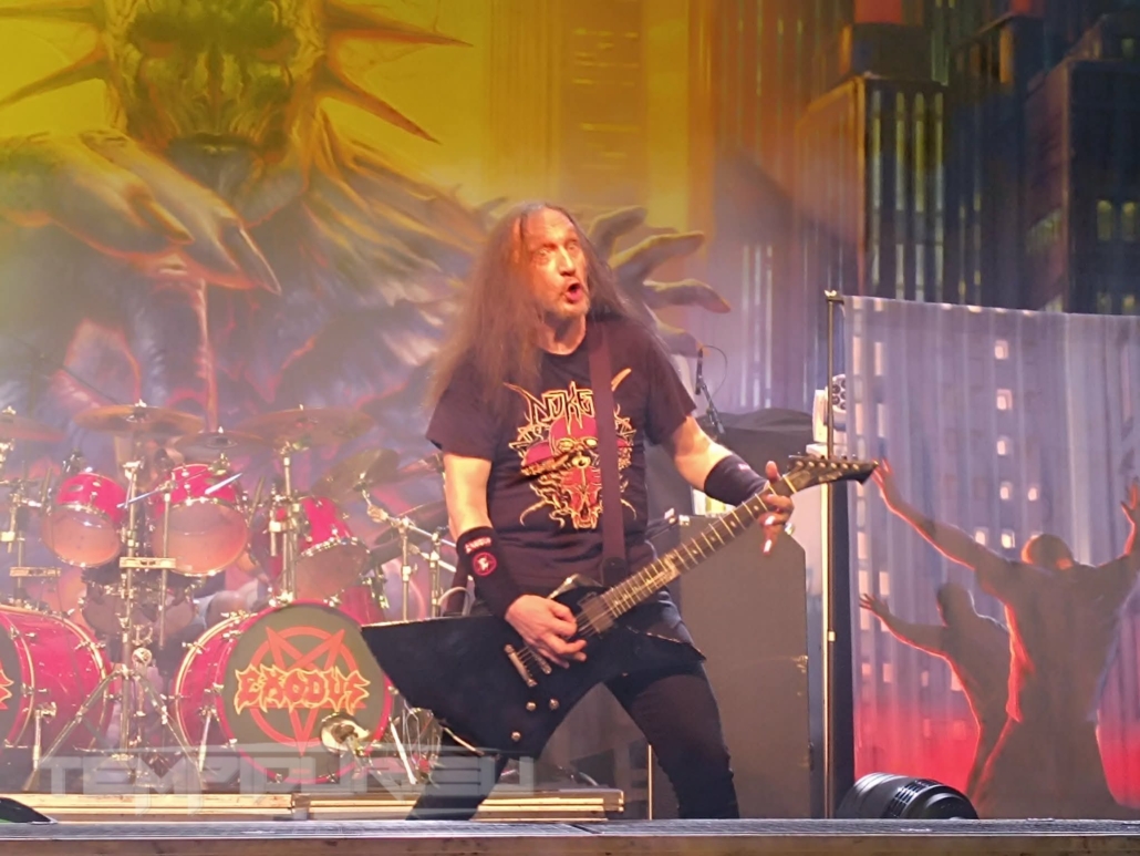 Purtroppo il lungo viaggio e il traffico non perdonano, perdo l’esibizione dei NAILS ed entro nel locale che hanno già iniziato gli EXODUS, l’atmosfera è già bollente e la platea animata dal circle pit durante Deathamphetamine, non poteva essere diversamente di fronte agli alfieri del thrash metal bay area. Con la successiva Goliath title track del nuovo dodicesimo disco, che può essere considerata una “pesante ballad” gli animi si calmano, dopodiché avendo un set piuttosto ridotto, sparano una bomba dietro l’altra come Blacklist e The Toxic Waltz, durante le quali il moshpit è già incontenibile e gli amanti del crowd surfing partono come razzi.