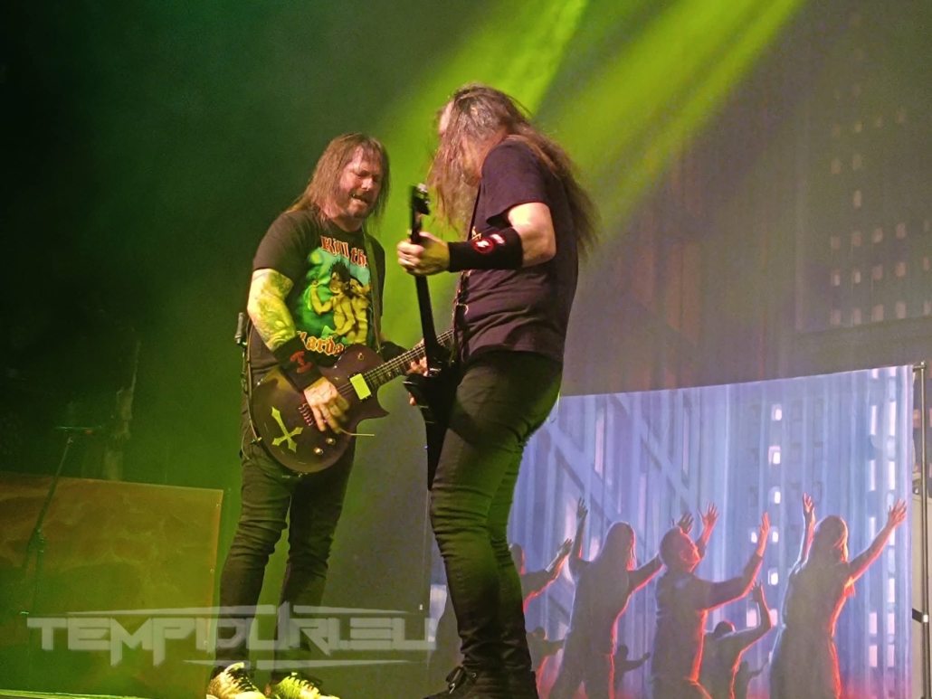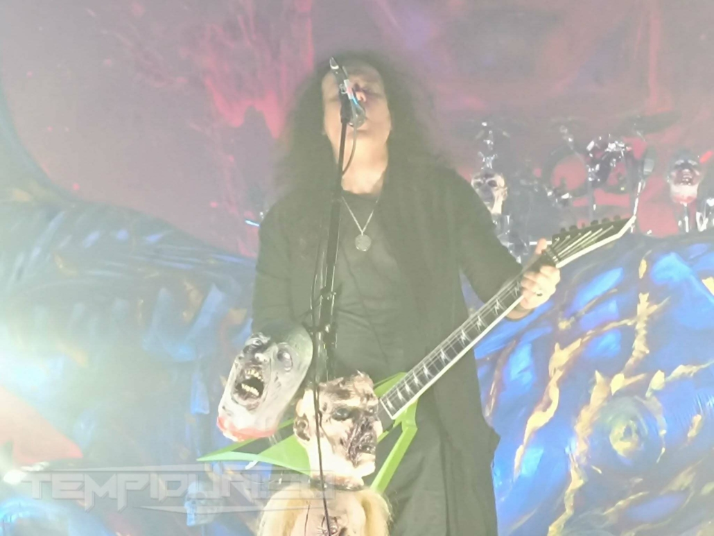 Con il procedere dell’esibizione si abbatte un diluvio di riff sanguinari ed assoli laceranti, viscerali linee di basso e una tormenta di piatti e pelli senza pietà, ogni componente tiene bene il palco e il contatto con il pubblico, l’inossidabile Mille incita a battere le mani a tempo e tutto ciò che concerne un concerto thrash, fomentando i fans con la tipica frase “The Kreator are return!”, e sottolineando sempre il piacere di suonare nella terra dei suoi genitori, tormentando i timpani con le sua sfregianti urla.