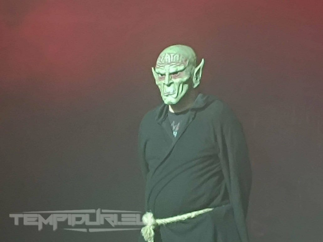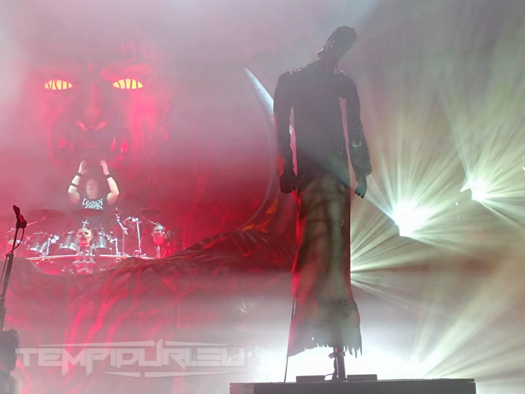 Dopo queste esibizioni che hanno già messo a dura prova le nostre ossa, siamo giunti al culmine della serata, durante il cambio palco viene calato un telone bianco, la tensione è altissima e quando le luci si spengono parte come intro, una videoproiezione con di sottofondo Eve Of Destruction di Barry McGuire. Alla fine partono le inquietanti note di Seven Serpents, dalla platea si sollevano urla e sul telone retroilluminato si stagliano le sagome giganti dei musicisti in posizione, ad un tratto il telone cade ed ecco i KREATOR, accompagnati dall’imponente scenografia incentrata su Krushers of the World, è l’inizio della distruzione.