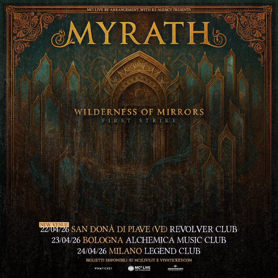 Comunichiamo che per motivi logistici il concerto dei MYRATH inizialmente previsto al New Age di Roncade (TV) il 22 aprile 2026, si terrà invece al Revolver Club di San Donà di Piave (VE).