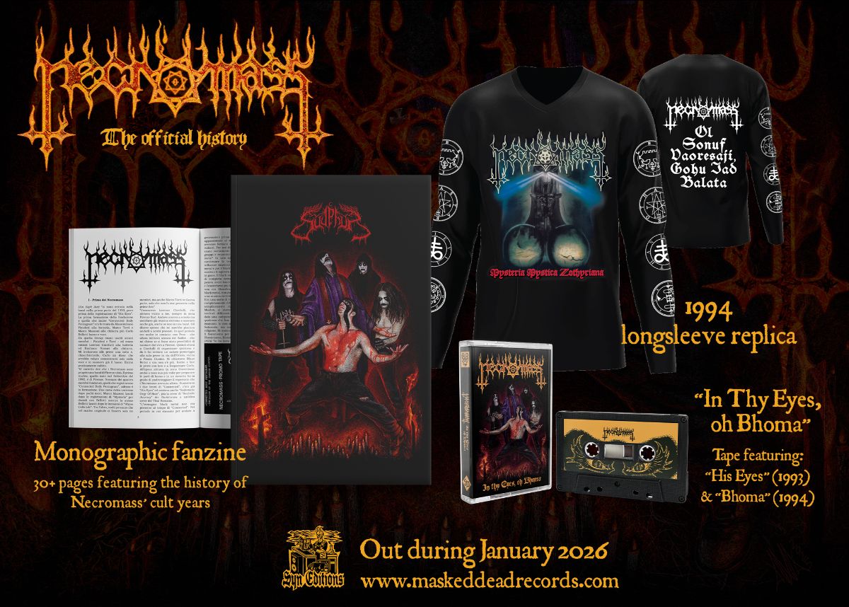 Necromass – The Official Story è un nuovo numero della serie di monografie di Syn Editions (Sulphur Fanzine), dedicato alle grandi band estreme italiane e non. Con più di dieci interviste inedite e una selezione di dichiarazioni d’archivio apparse su riviste, fanzine e webzine nel tempo, ricostruisce la carriera dei Necromass attraverso tutti gli anni Novanta, focalizzandosi anche sui personaggi e il contesto della Firenze metal: la Contempo, l’Angelo Azzurro, i concerti all’Auditorium Flog e molto altro. Il lungo speciale è corredato di foto d’epoca, flyer e memorabilia del periodo.