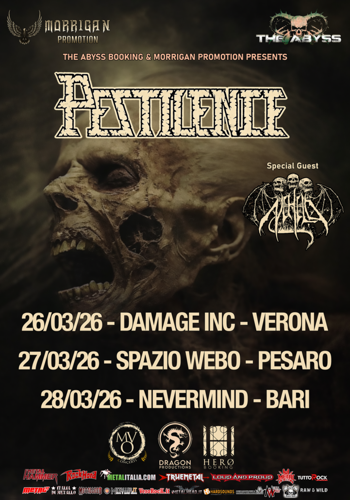 Dopo il successo dei loro concerti italiani dello scorso Novembre i seminali PESTILENCE, band tra le più influenti ed innovative in ambito technical death metal, ritornano in Italia a Marzo in occasione del loto tour europeo “Entering The Portals Tour 2026” per tre show esplosivi. Ad accompagnarli in tutte le date del tour ci sarà la cult death metal band svizzera Nihilo che da oltre venti anni tiene alto il vessillo del metal estremo .Il primo degli show previsti avrà luogo giovedì 26 Marzo presso il Damage Inc di San Giovanni Lupatoto (VR) e vedrà tra gli special guests anche i death progsters Epigrafi e gli esplosivi 5Rand con il loro deathcore estremo, ormai un nome consolidato nel panorama metal europeo.