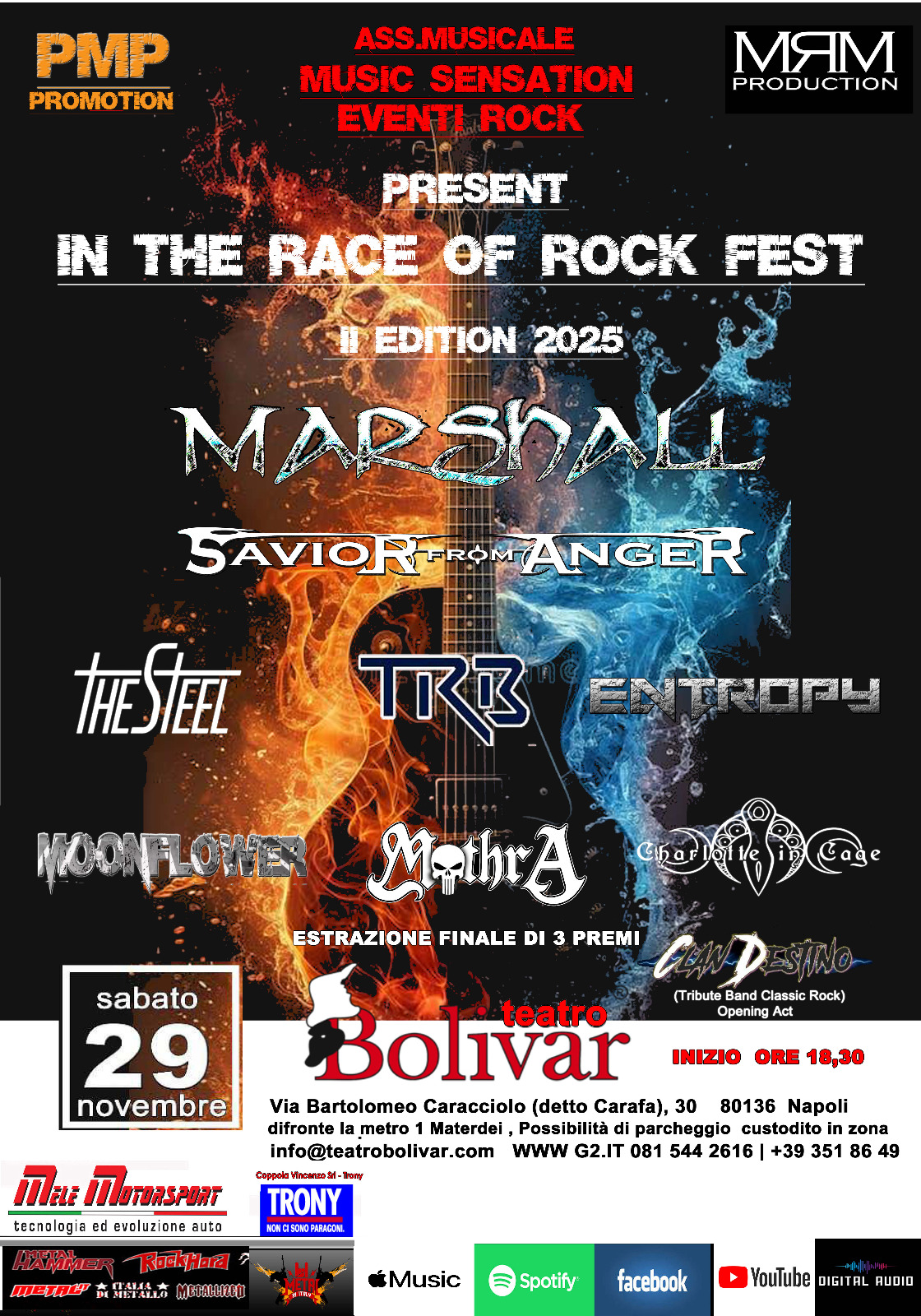 IN THE RACE OF ROCK FEST II edizione che si svolgerá sabato 29 novembre 2025 ore 19.30 nella splendida location del Teatro Bolivar nel cuore di Napoli .
