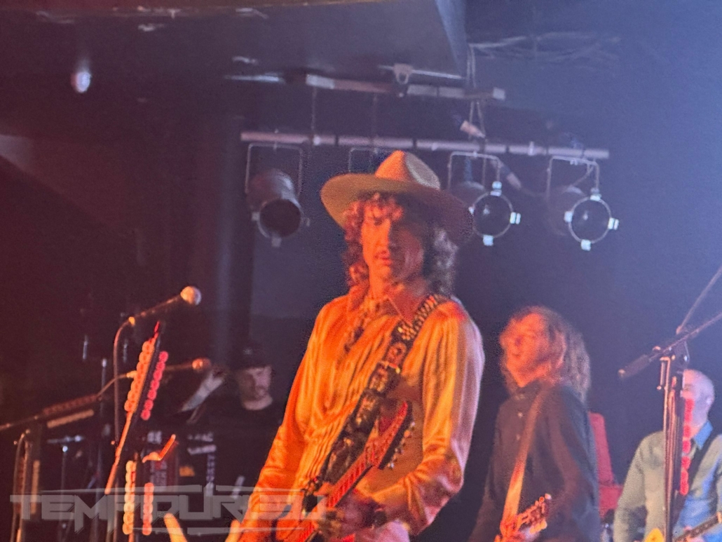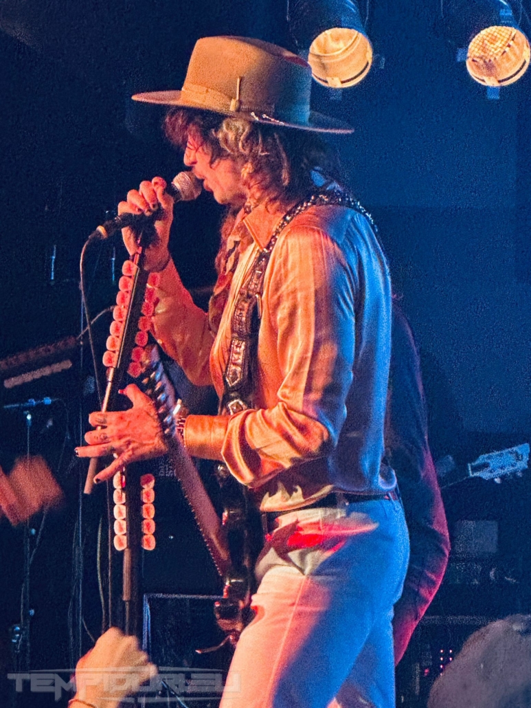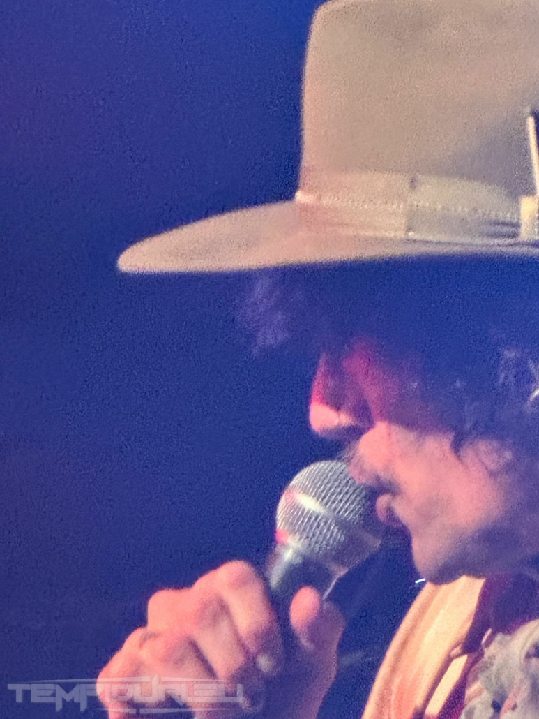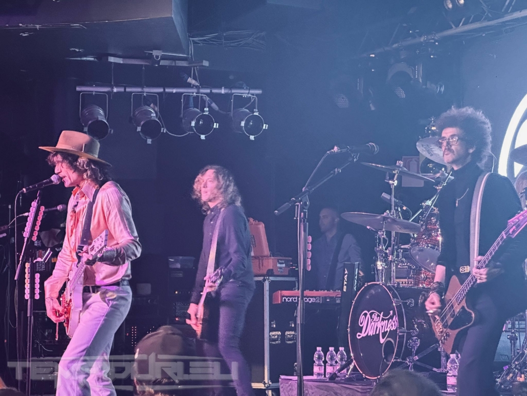 Basso, il fratello di Hawkins Daniel alla chitarra ed alla fine come in un trionfo con la sua camicia dorata traslucida, cappello alla Johnny Depp, pantalone bianco a zampa di elefante e stivale a punta in stile Van Halen arriva il frontman Justin. La band ci propone due ore di show con diciannove brani più un encore che saccheggiano la loro discografia ma in realtà saranno solo quindici, perché cinque sono cover credo fatte al momento per intrattenere il pubblico ma di questo momento ne parlerò dopo…. Aprono la serata con un brano Rock and roll party Cowboy , dal loro nuovo album Dreams On Toast del 2025, brano ben fatto ma con rimandi a brani del tempo dei Poison nulla di che, meno male che si attinge subito al loro passato con Growing On Me dal loro primo album Permission To Land brano spettacolare di un’energia e potenza unica riascoltandolo, sono ripiombato ventidue anni fa all’epoca avevo venticinque anni impazzivo per Him e Type O Negative (tuttora), eppure quando passarono il video su MTV capii che erano geniali!! Veramente bella in sede live. Altra bomba dal passato Get Your Hands off My Woman dove il singer dimostra che la voce non è diminuita ma migliorata come il buon vino e l’apporto in sede ritmica ha un quid in più grazie a Rufus Taylor che alla batteria è un muro sonoro veramente figlio d’arte del padre anzi credo che a tecnica gli sia superiore perchè con i Queen faceva cose più semplici invece il figlio è molto più tecnico e metal. Proseguono brani dall’ultimo repertorio Mortal Dread e Motorheart e Walking